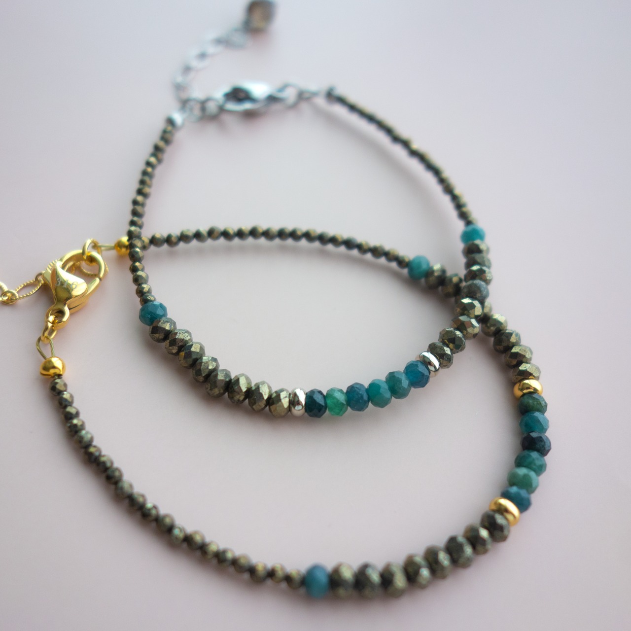 メタリックな輝きとシックな輝きがモダンな印象のパイライトを一連に紡ぎ、シンプルなブレスレットにしました。