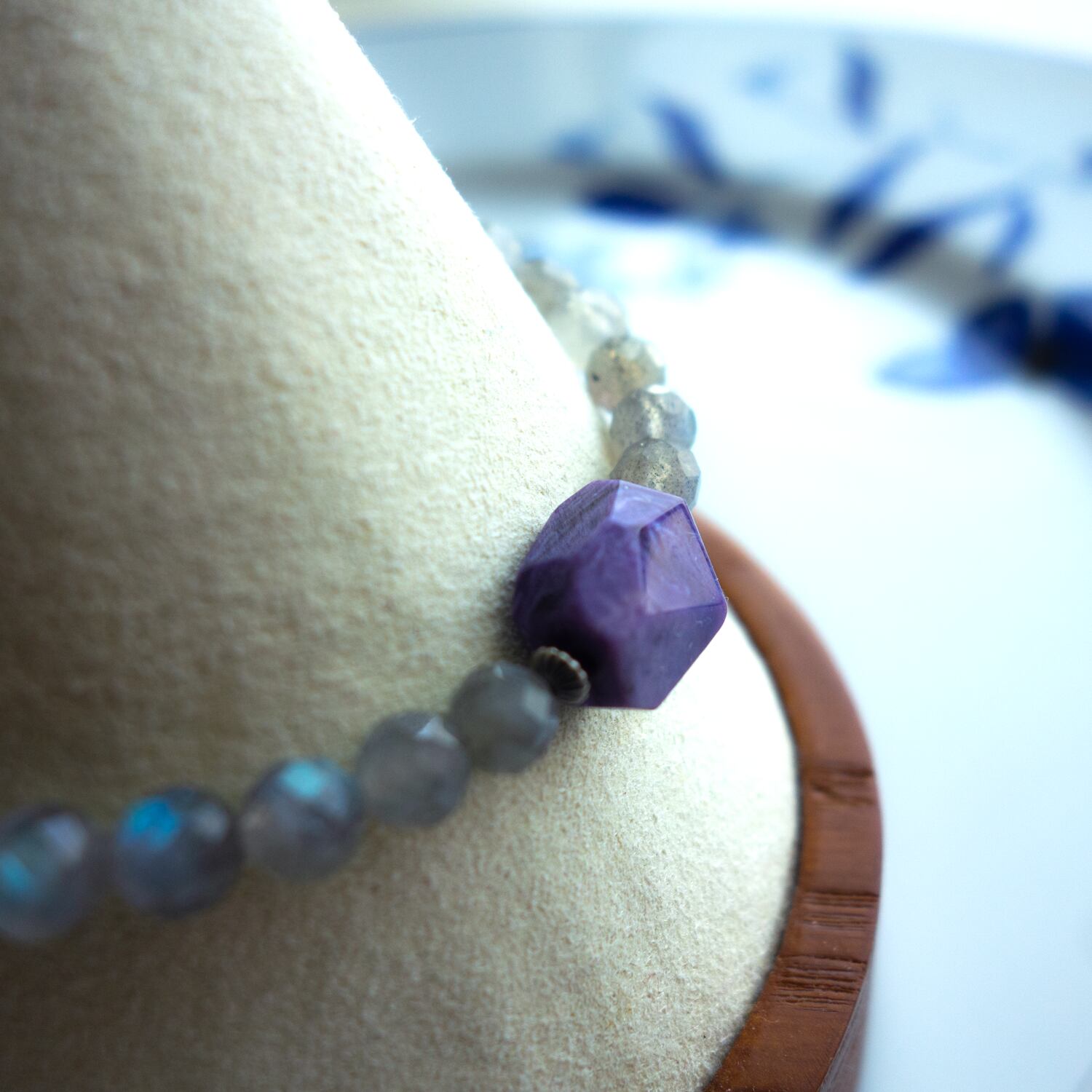 ラブラドライトの青い光が相乗効果となって、一層ストーンの魅惑を手元に感じていただけるお品です。