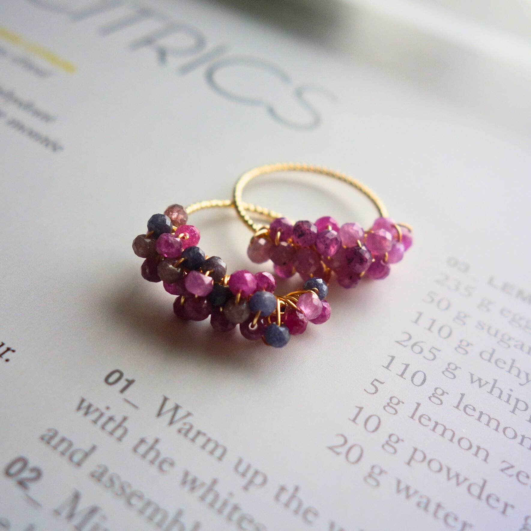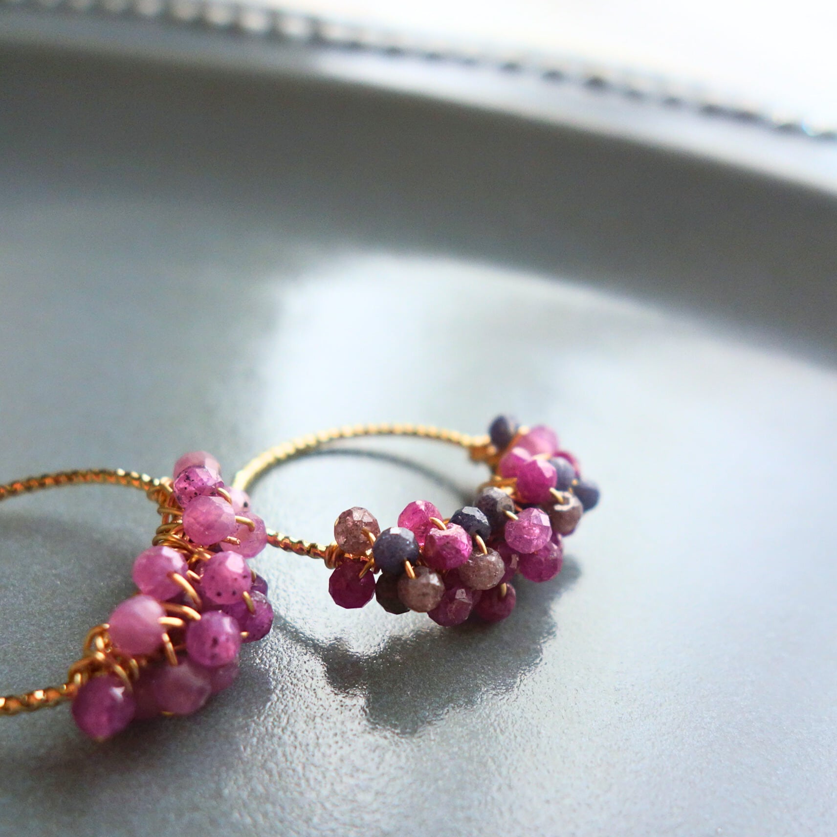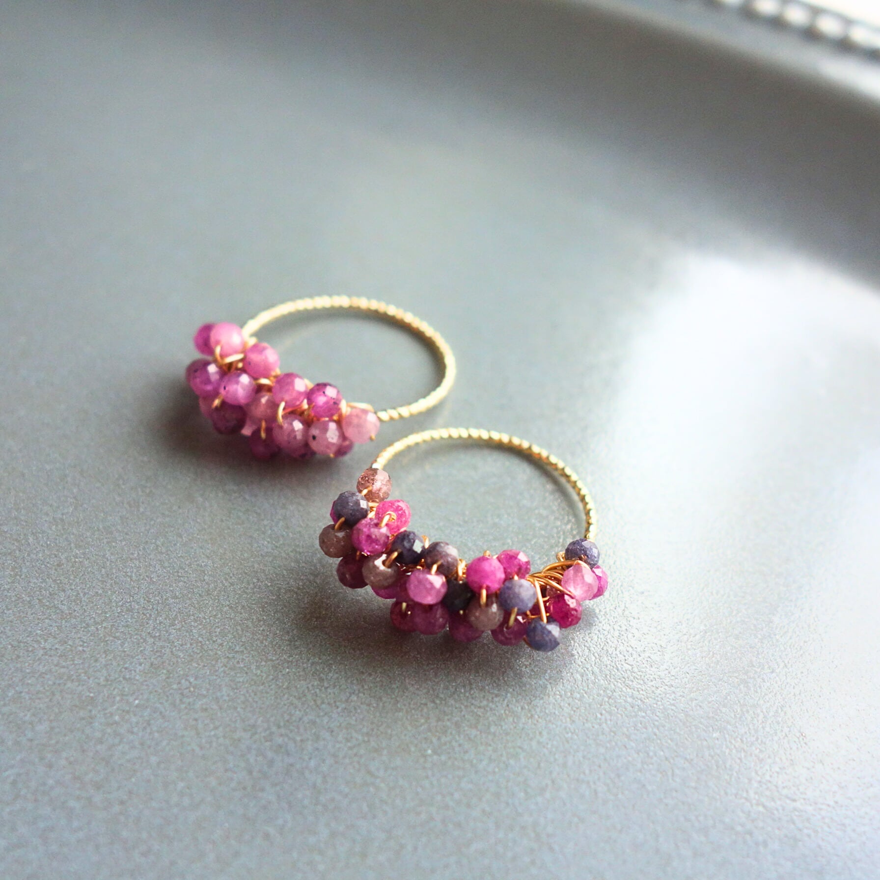 こちらのワイヤー(14Kゴールドフィルド)はツイスト彫刻入りで質感がよく、華奢ながらとてもしっかりとしていて、たくさんのトーンを支えています。