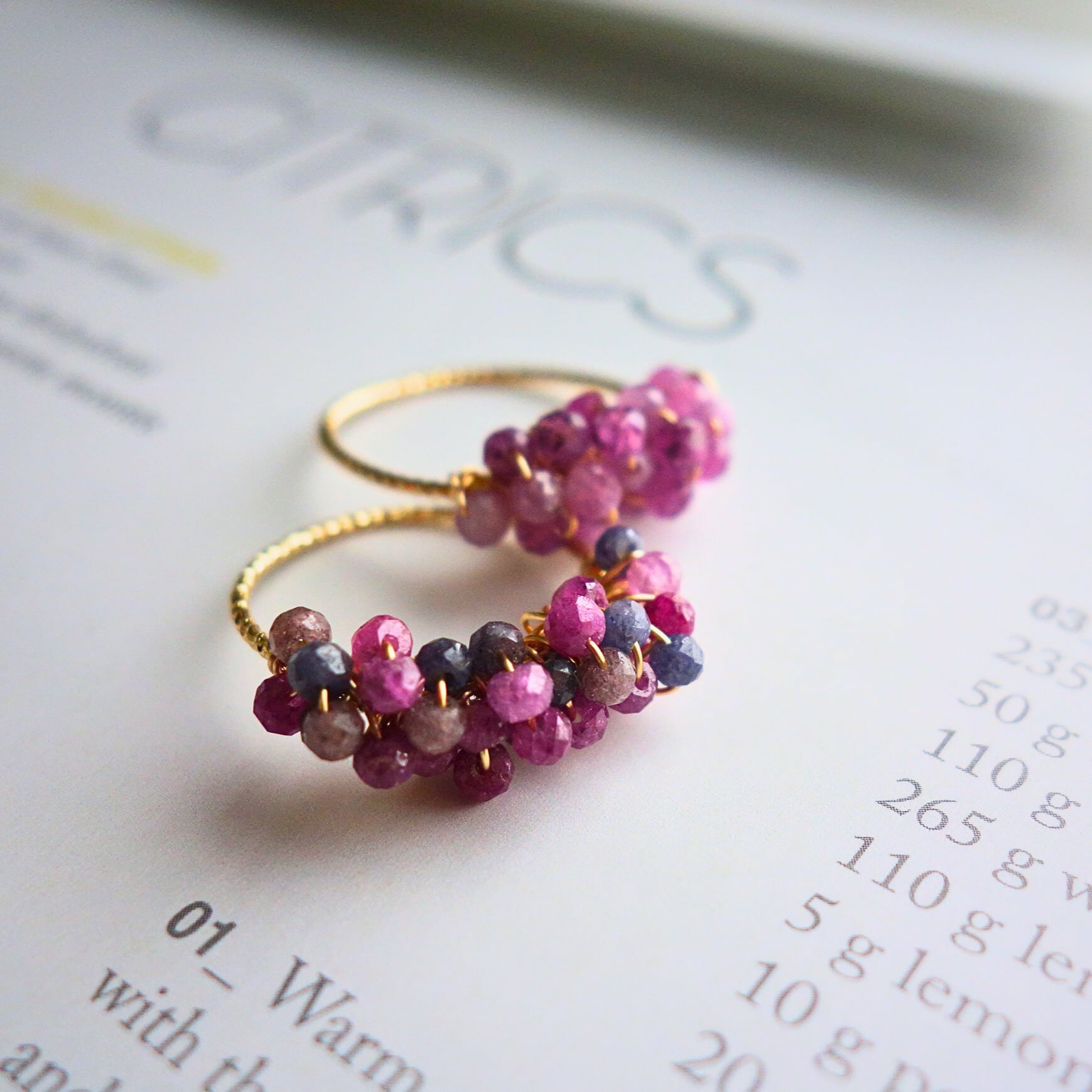 鮮やかで濃淡豊かな色彩が連なるMIXコランダムのストーンは、お手元に華やかさと落ち着きを兼ね備えた印象を与えます。