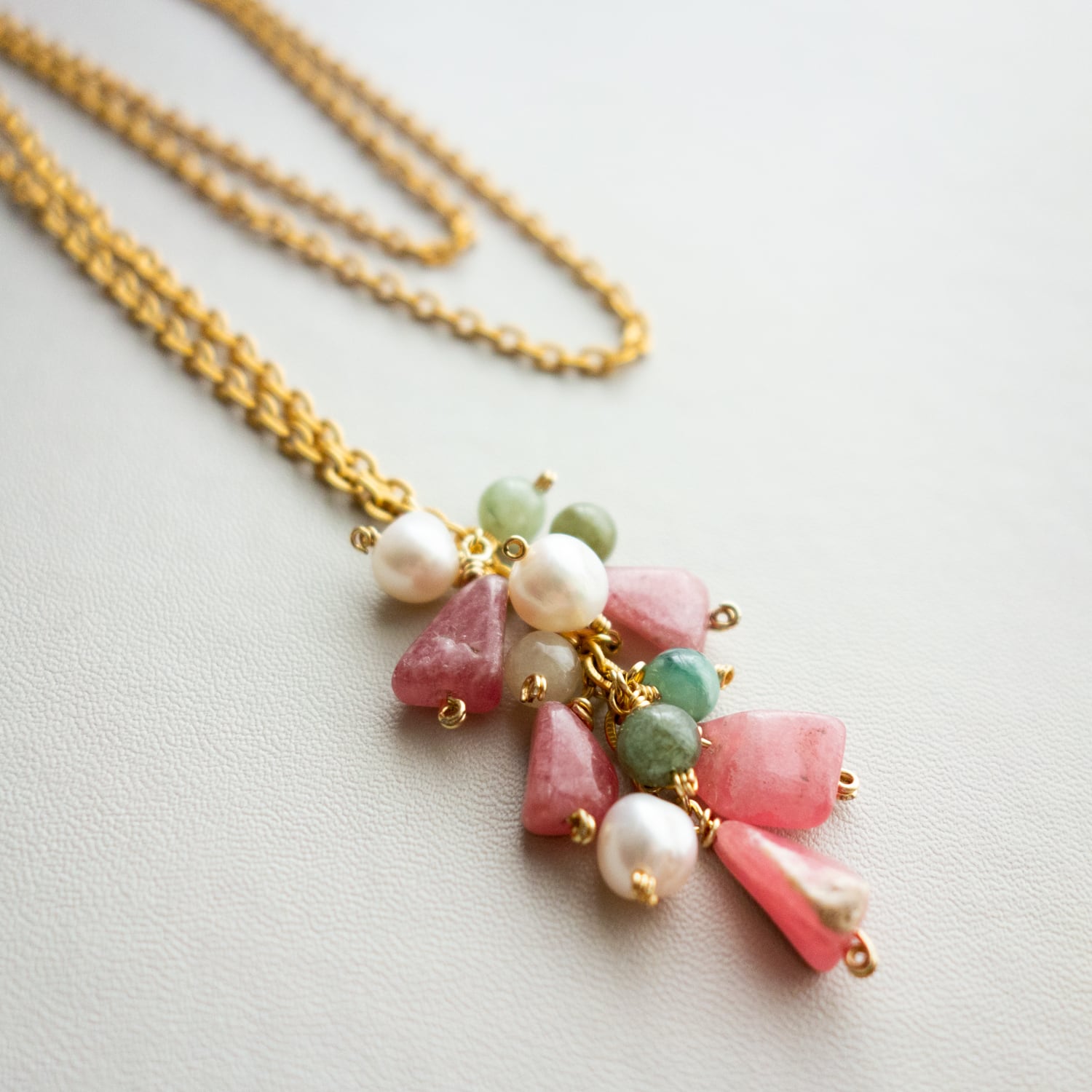 インカローズ(さざれ)、翡翠、淡水パールのアレンジです。