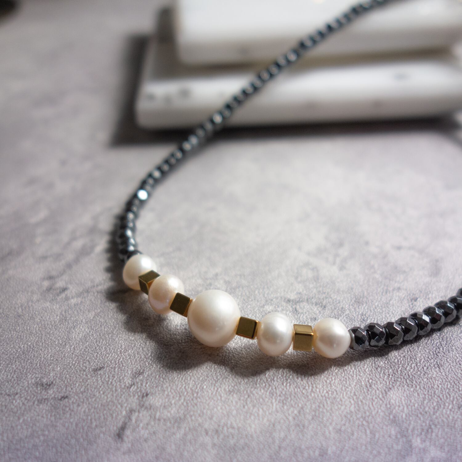 こちらのデザインは、カットの入ったヘマタイトの細かいビーズに