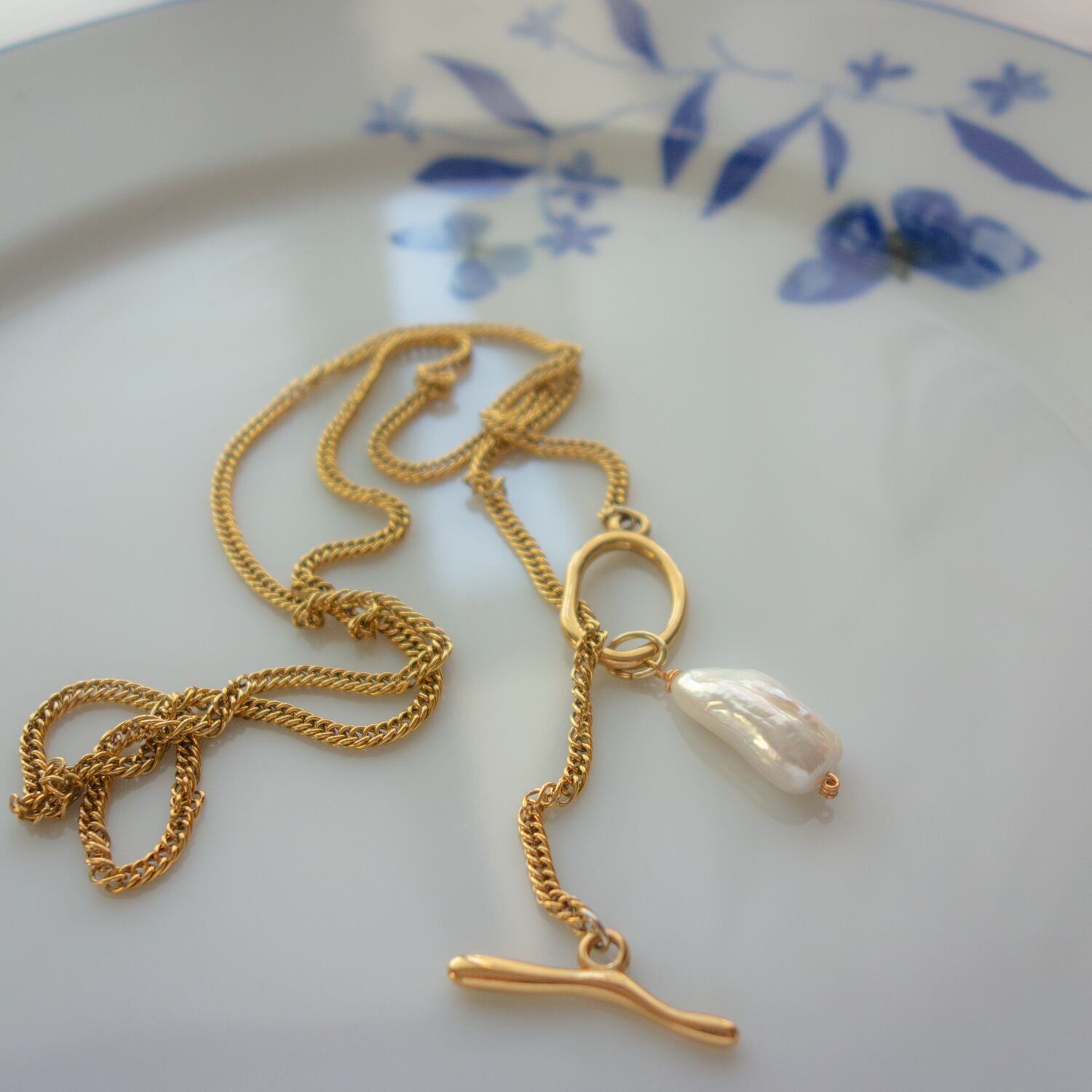 こちらのデザインは、チェーン×大粒「ビワ淡水パール」のネックレス