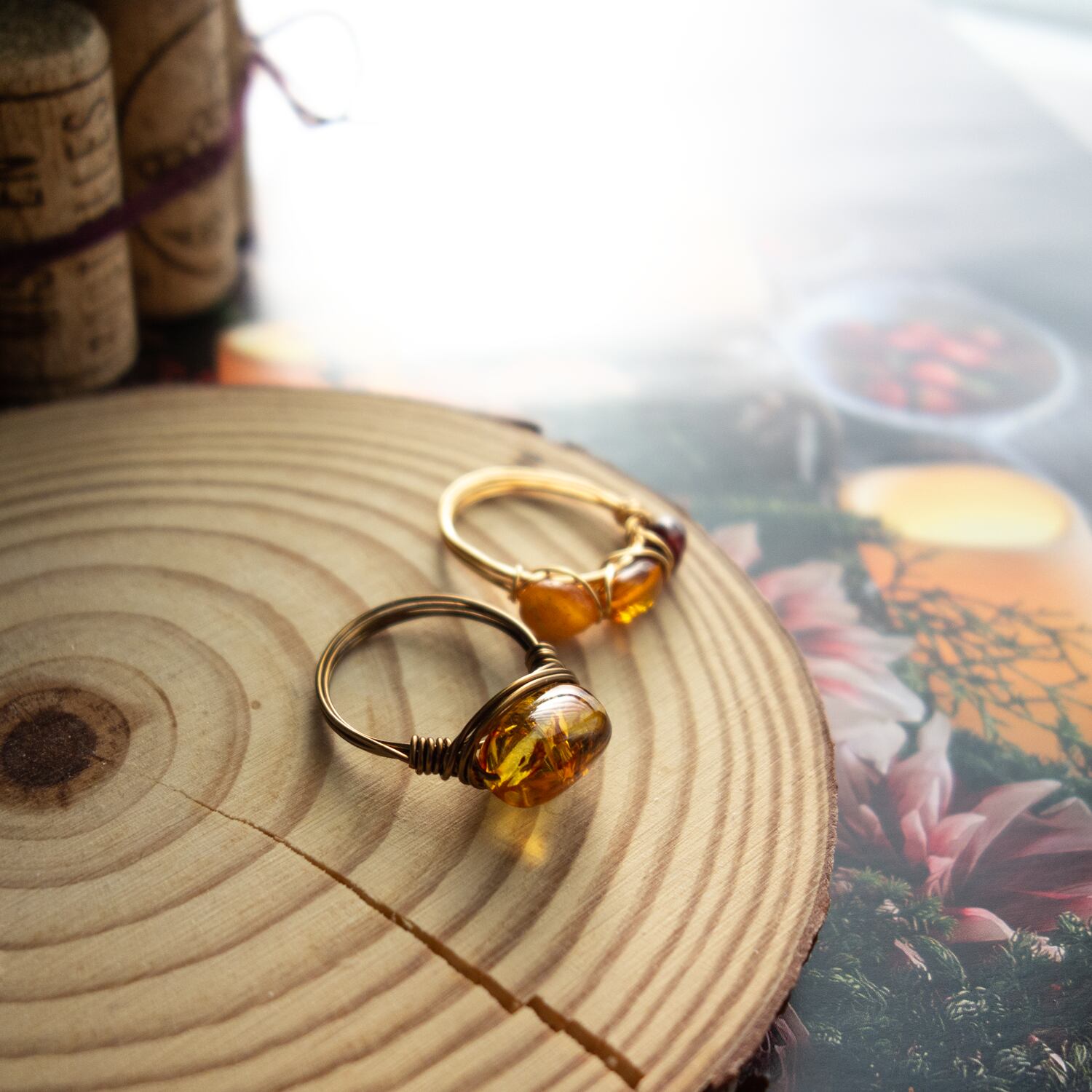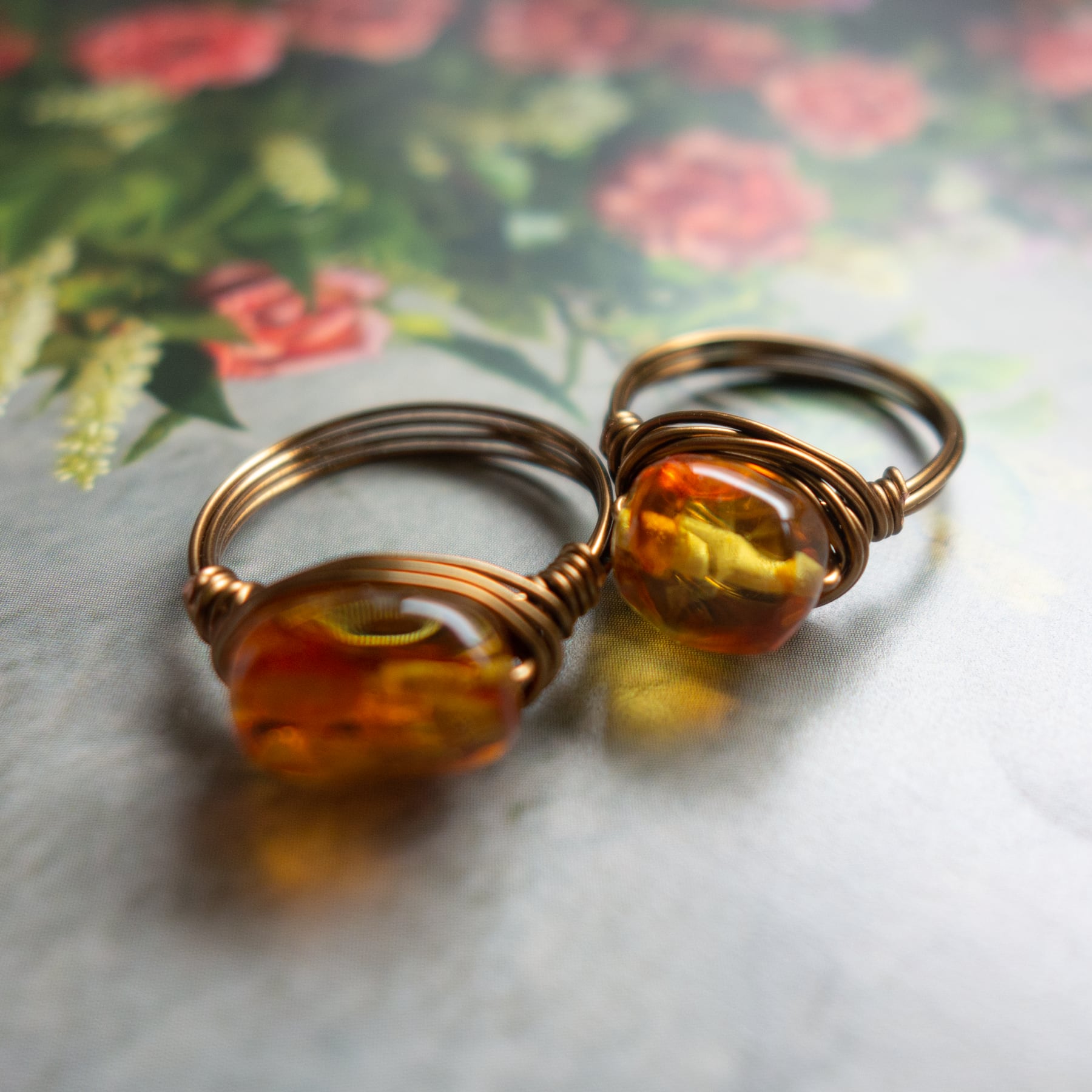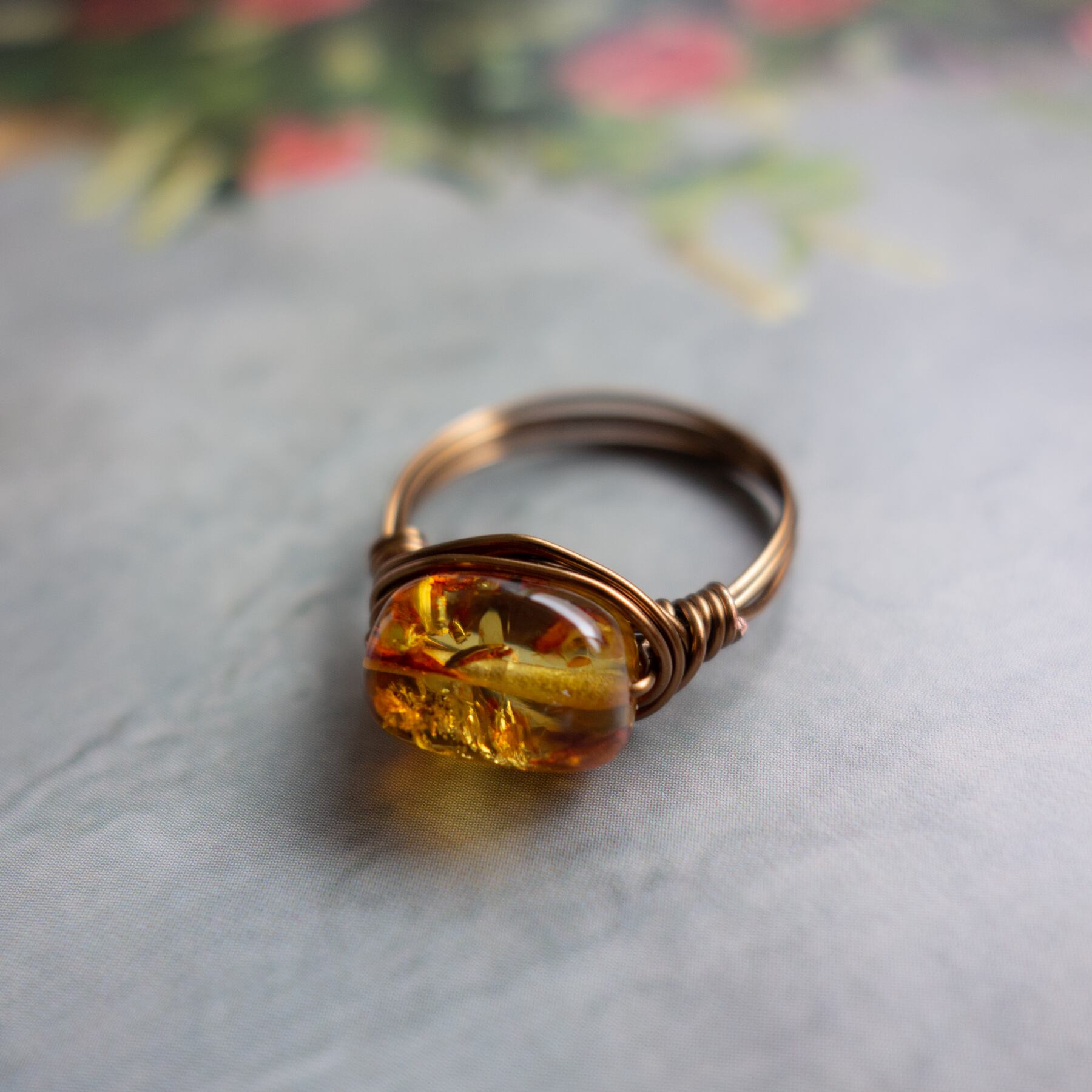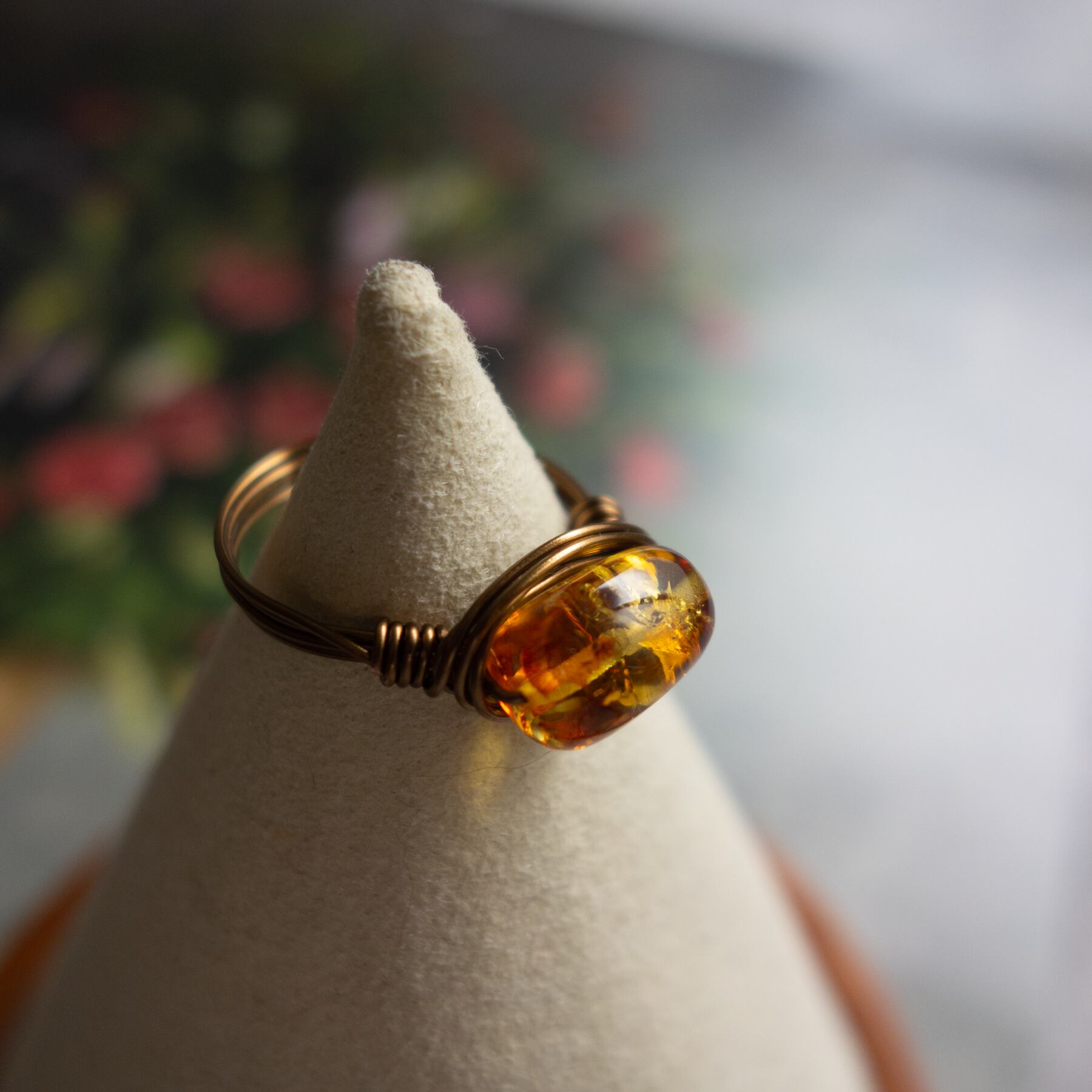 こちらは、つるんとした形のタンブルカットの琥珀をワイヤーリングにしました。